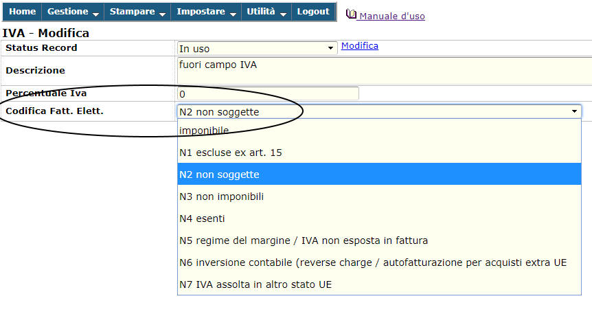 Il campo "Codifica Fatt. Elett." deve essere impostato per tutti record attivi in nella tabella IVA, se percentuale IVA >0 impostare "imponibile" o scegliere N1, N2 ecc. se il percentuale IVA = 0